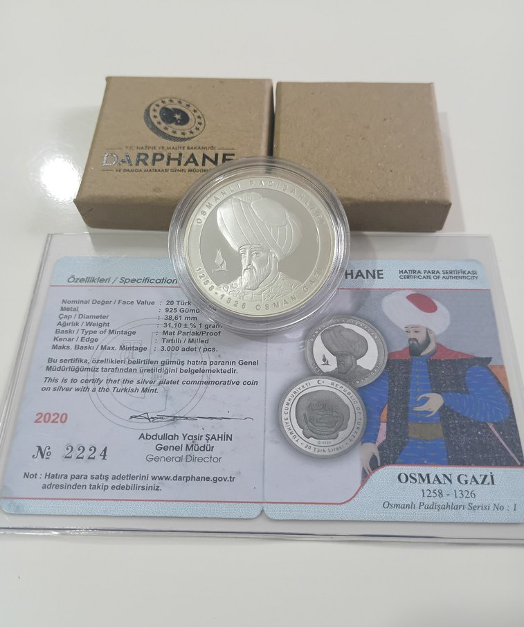 925 ayar, 31.61 gram gümüşten Osmanlı Padişahı Osman Gazi'nin portresini taşıyan hatıra parası. Sertifika ve orijinal kutu ile birlikte.