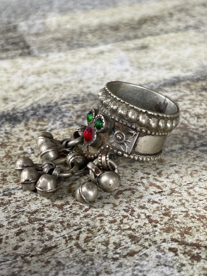 Boncuklu detaylara ve sallanan süslemelere sahip renkli bohem kadın yüzüğü, vintage tarz ve düğünler için uygun.