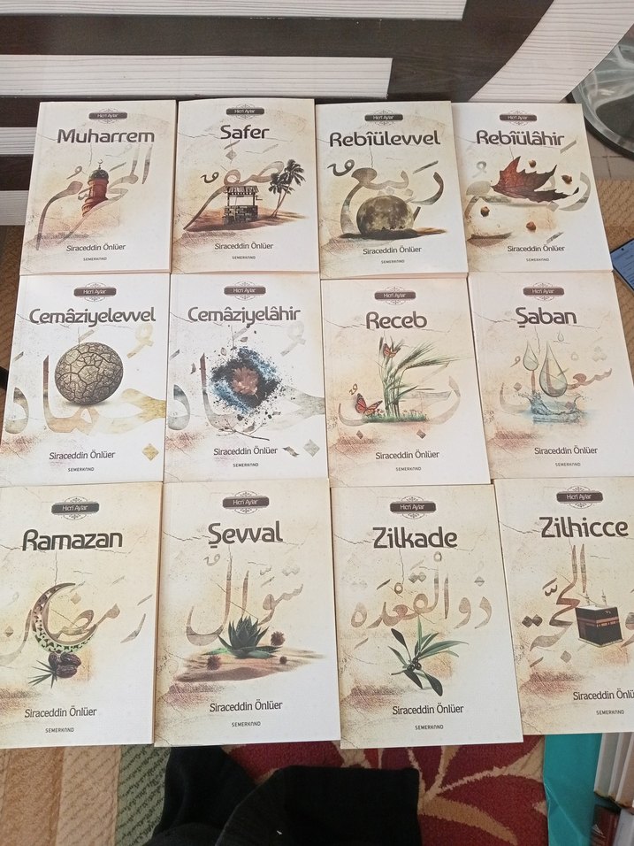 Her biri farklı İslami ay ismi taşıyan Osmanlıca kitap seti, geleneksel hat ve illüstrasyonlarla.