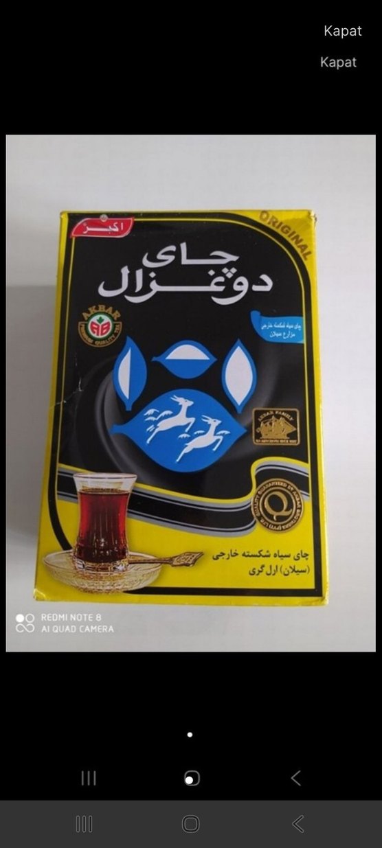 Kutu üzerinde Osmanlı tarzı iki geyik ve çay bardağı figürü bulunan orijinal siyah çay paketi. Detaylı etiketli ve kaliteli siyah çay içerir.