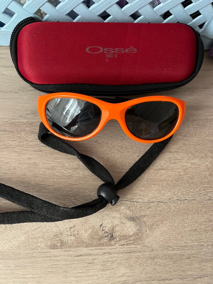 12-36 ay çocuk osse markalı gözlük.Turuncu renkli çocuk güneş gözlüğü, elastik bant ve koruyucu kutu ile birlikte gelir. Renkli baskılı deseni ve güneş korumalı camları vardır. Çok az kullanıldı, tertemiz gözlük, ihtiyacı olam kaçırmasın.