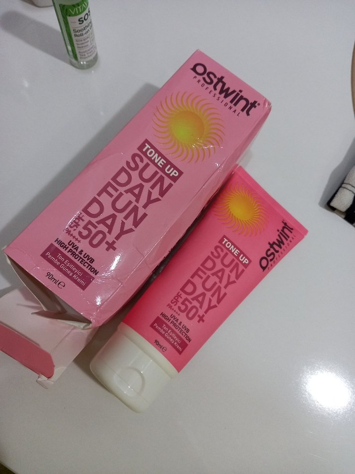 Ostwint Tone Up Sun Day kremi, SPF 50+ yüksek koruma sağlar. UVA ve UVB filtreleri ile cildi güneşin zararlı etkilerinden korur, 90 ml tüpte sunulur.