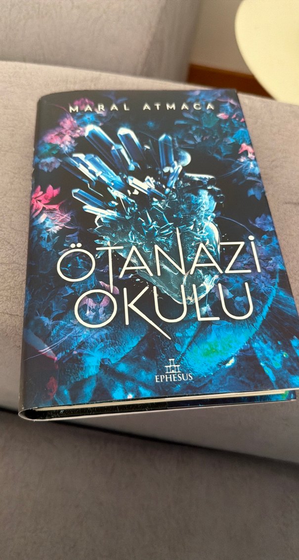 Maral Atmaca'nın "Ötanazi Okulu" adlı romanı, derin temaları işliyor. Ephesus tarafından yayımlandı. Kapağında mavi ve mor kristal tasarım var.