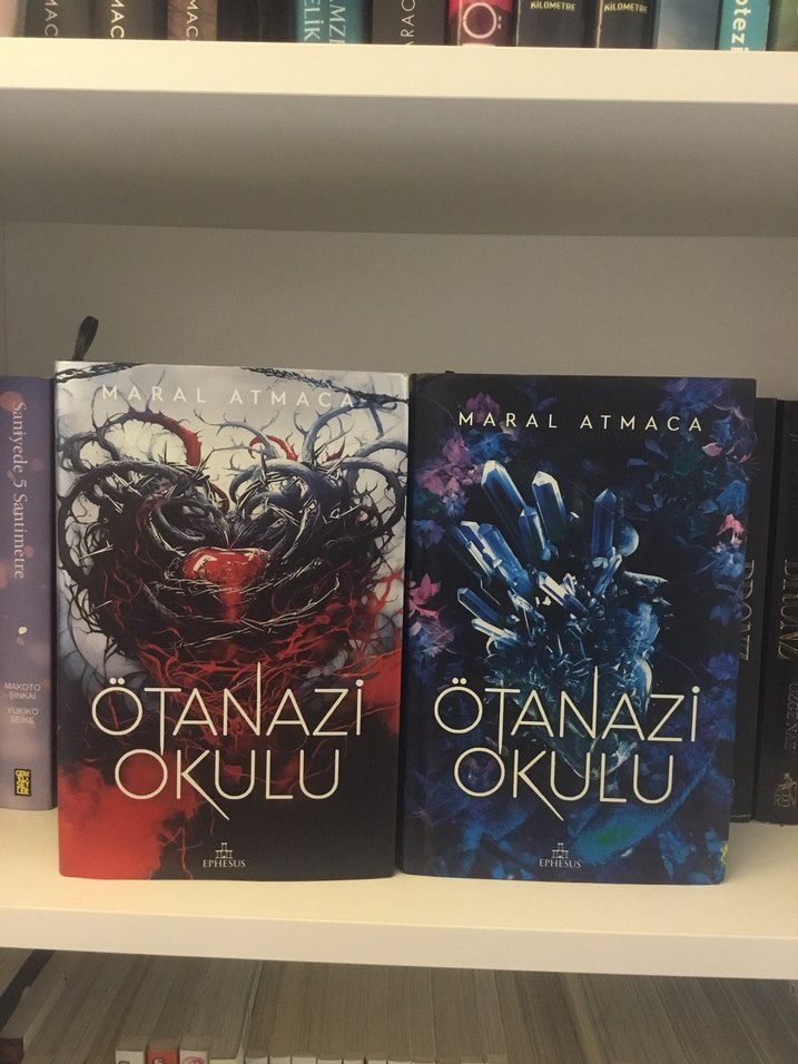Maral Atmaca'nın "Ötanazi Okulu" adlı kitabı, karanlık ve mistik kapak tasarımlarıyla iki ciltten oluşur. Kitaplar sürreal ve kristalimsi görseller içerir.