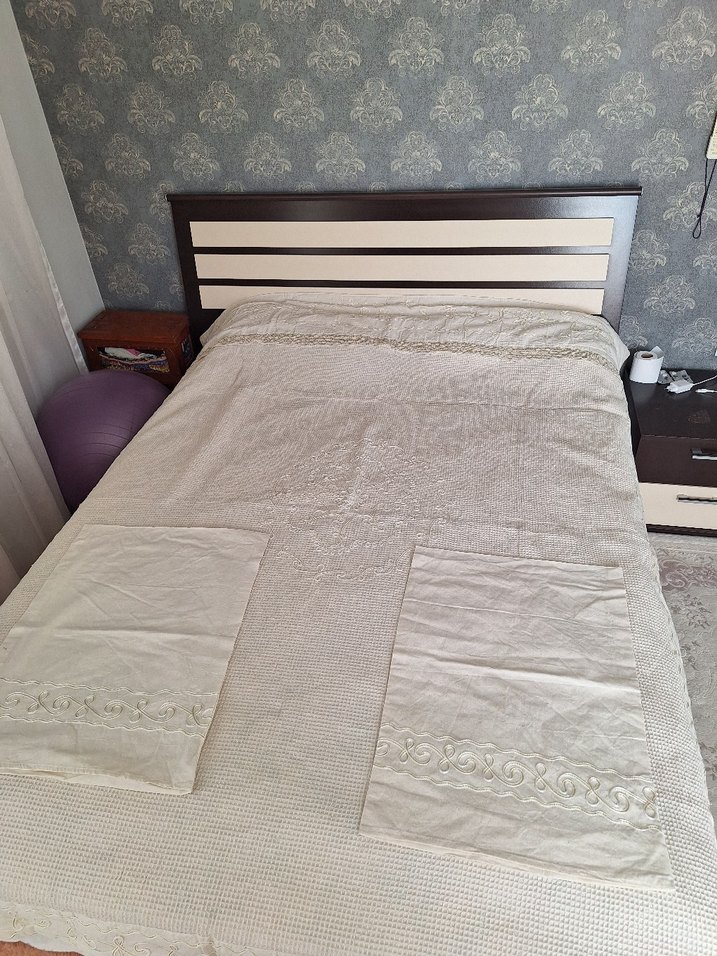 Gri nakışlı beyaz yatak örtüsü, yatak odasına zarif bir dokunuş katıyor. 2 adet yastık kılıfı,1 adet pike .yatak örtüsü olarakta kullanılabilir.Hediye geldi.hic kullanmadım.cift kişilik.kumaşi Buldan kumaşı diye düşünüyorum