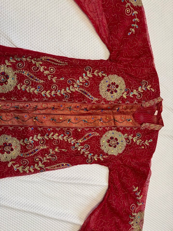 Kırmızı uzun kollu, V yakalı, fermuarlı ve işlemeli bu dar kesim elbise, kına ve özel günleriniz için uygundur.