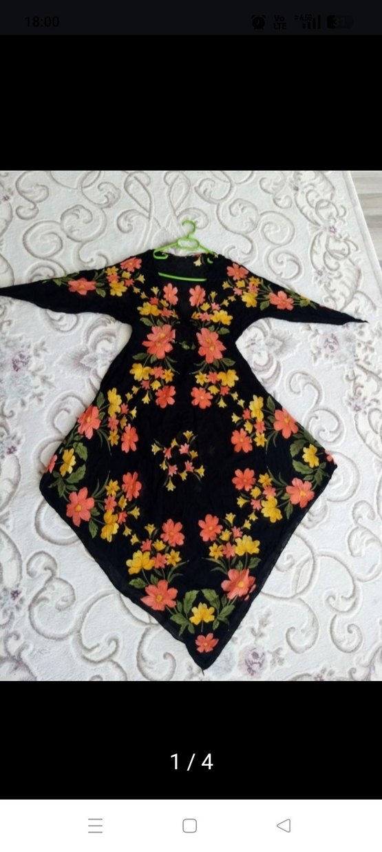 M beden uyumlu bel 38 boy 46 cm kollu, dökümlü ve bol kesim pareo, V yakalı ve koyu zemin üzerine canlı çiçek desenli, bohem tarzına uygun.