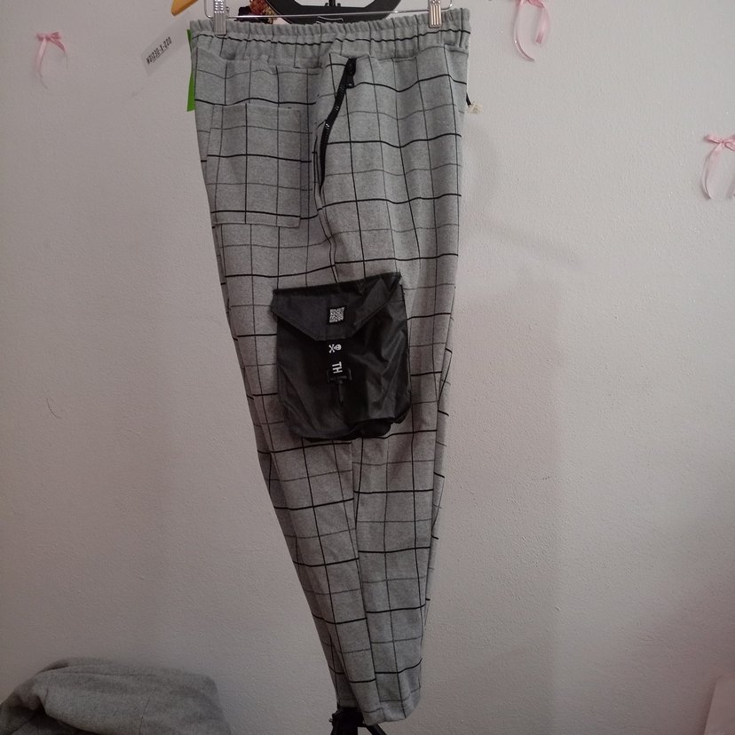 Gri kareli desende, kemerli ve rahat kesim erkek pantolon. Sentetik kumaştan üretilmiş, midi boyda ve sokak stiline uygun bir tasarım.