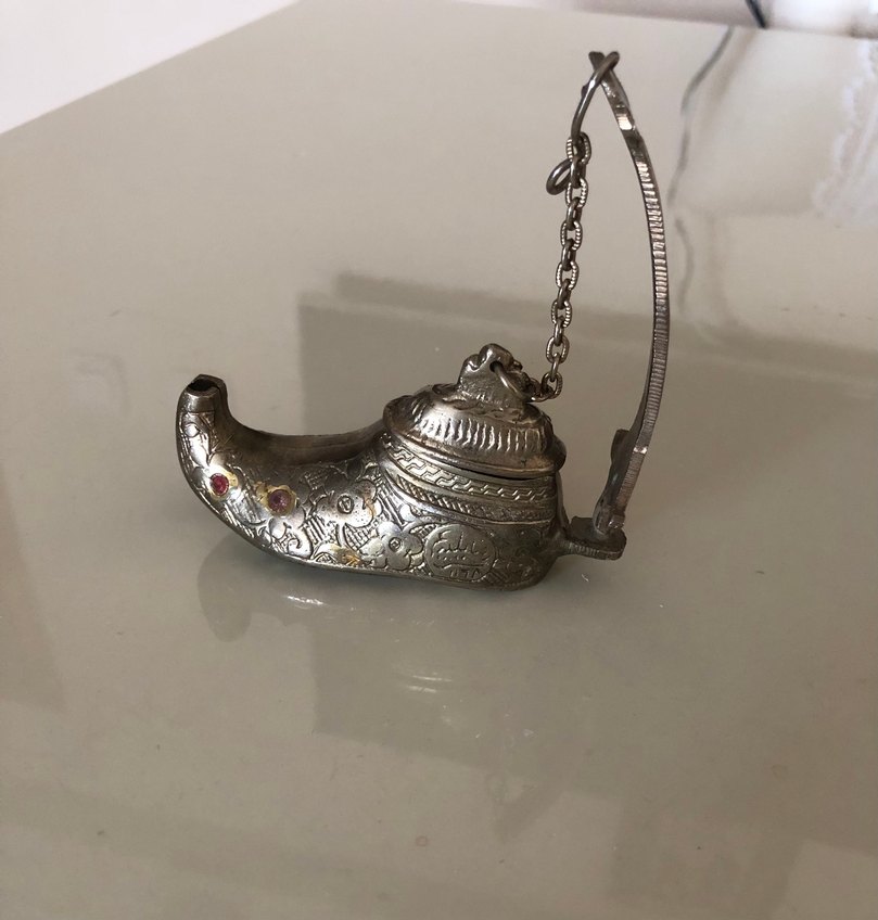 Üzerinde ince işçilikli kabartma desenler ve çiçek motifleri bulunmaktadır. Üzerinde pembe/kırmızı renkli taş işlemeleri mevcuttur. Kapaklıdır ve kapağı gövdeye şık bir zincirle bağlıdır. Kitaplık raflarında, orta sehpalarda veya otantik dekorasyon köşelerinde sergilemek için harika bir parçadır.