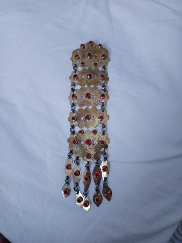 Altın renginde, boncuk işlemeli ve nakış detaylı kadın broş. Bohem tarzda, koyu tonlarda ve sallantılı parçalar içerir. Günlük kullanım için uygundur. ✨ Türkmenistan yuresel kolyesi