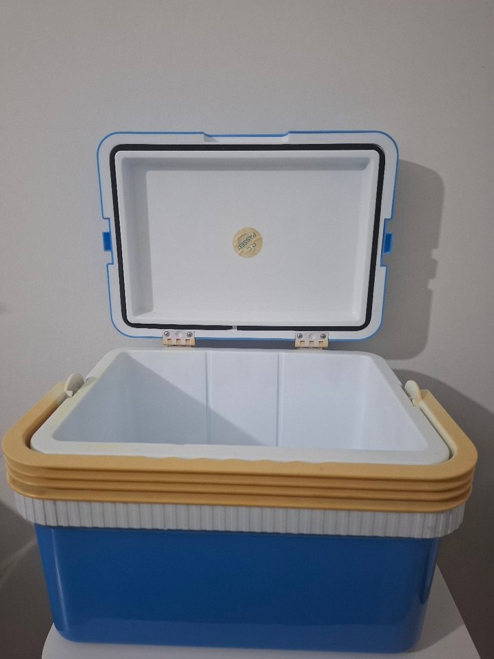 Mavi renkli, beyaz kapaklı ve bej saplı, yiyeceklerin taşınması ve saklanması icin odeal kampta sahilde yaylada
