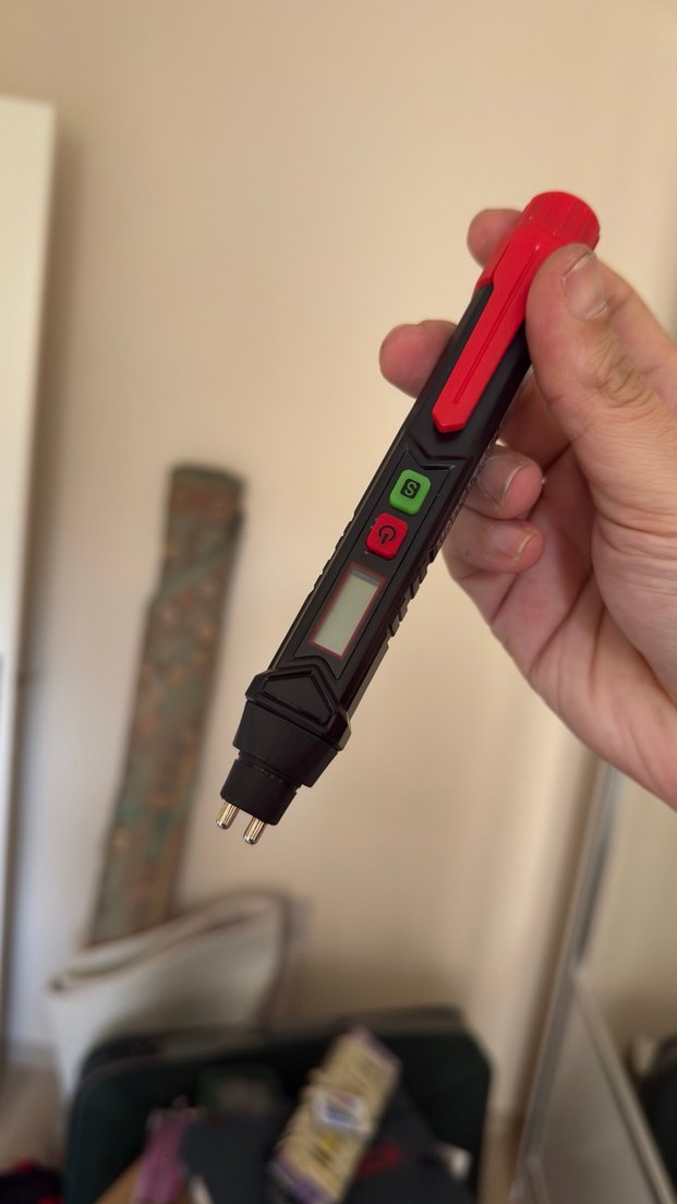 Renkli, küçük ekranlı ve iki metal probu olan dijital test cihazı. Kompakt ve elde taşınabilir yapıda.