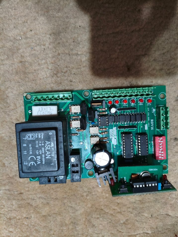 Kondansatörler, dirençler ve entegre devreler içeren yeşil devre kartı. Siyah bir transformatör ve çoklu konektörler bulunur. ️