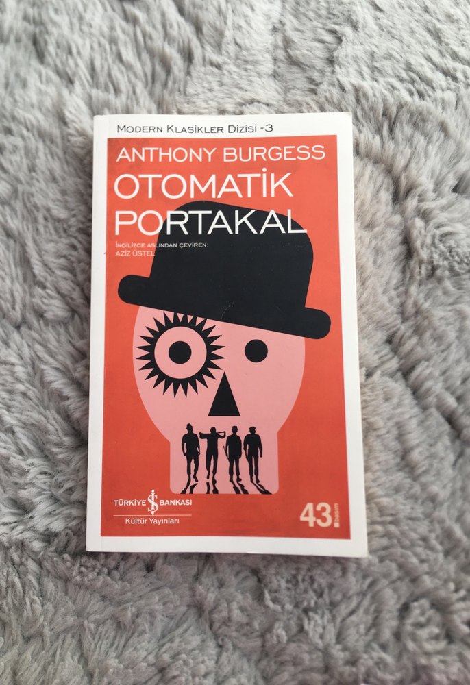 Anthony Burgess'in Otomatik Portakal romanı, Modern Klasikler serisinden Türkiye İş Bankası yayınları arasında, dikkat çekici turuncu ve siyah kapak tasarımıyla.