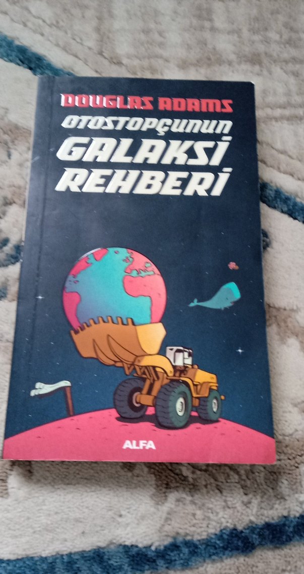 Douglas Adams'ın Otostopçunun Galaksi Rehberi adlı çizgi romanı, büyük bir küreyi taşıyan traktör görseliyle mizah ve kozmik macerayı birleştiriyor. Alfa yayınları.