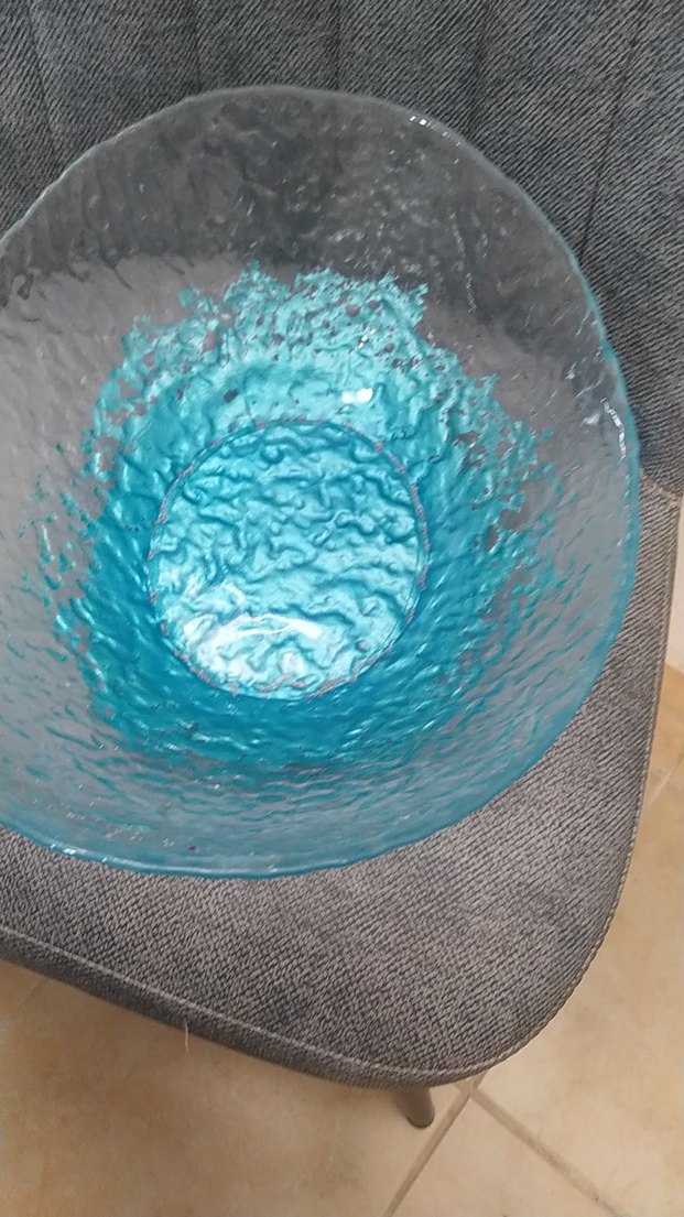 Parlak mavi renkte, dokulu yüzeye sahip çağdaş tasarım cam kase. Canlı rengiyle sofranıza modern bir dokunuş katar. pandemide kendim boyadım sorunsuz ürün