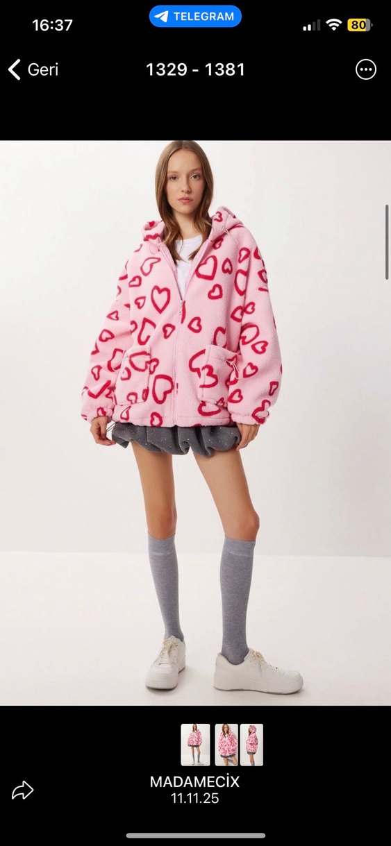 Kapüşonlu, bol kesim kız çocuk ceketi, yumuşak tüylü detaylara sahip ve pastel pembe kalp desenli. Sokak modasına uygun, sıcak tut