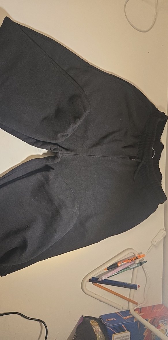 Siyah, rahat kesim, orta boy kadın eşofman altı. Yumuşak ve sıcak kumaştan, dış mekan kullanımı için uygun, desensiz ve şık bir tasarım.