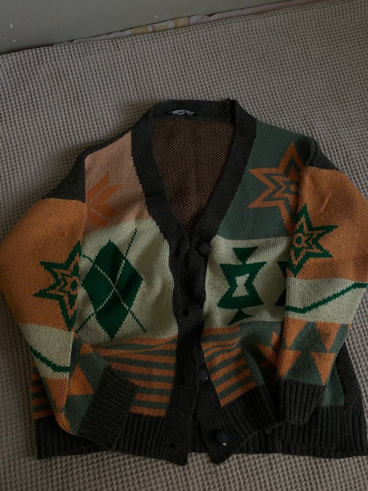 Kahverengi desenli örgü kadın hırka, notlu yaka ve uzun kolludur. Rahat kesim ve midi boyda, günlük kullanıma uygundur. Rahat ve trend tarzda.