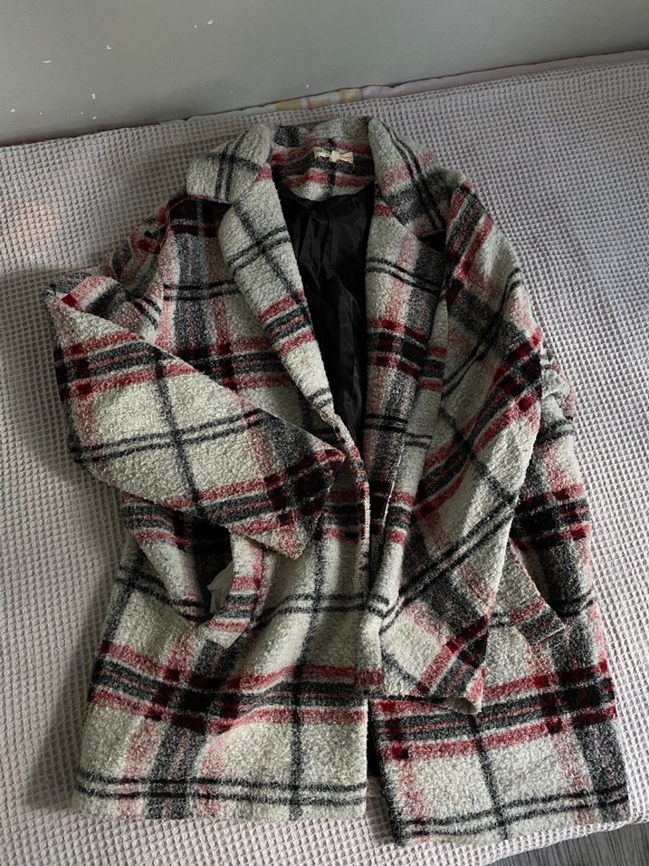 Yumuşak yünden, ekose desenli gri kadın kaban. Geniş kesim, normal boy, kürk detaylı ve uzun kolludur. Rahat sokak stili için uygundur.