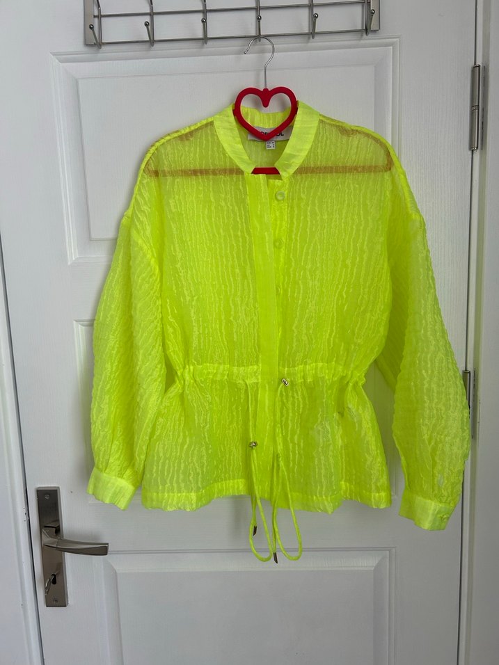 Şeffaf kumaşlı, yüksek yakalı, bol kesim parlak açık yeşili uzun kollu mini gömlek, belde bağcık detayı ile sokak modasına uygun. düşük omuz modeli olduğu için omuz genişliği ölçüsünü veremiyorum. yüksekliği 64 cm koltuk altı 53 cm kol boyu boyundan 70 cm OVERSIZE model
