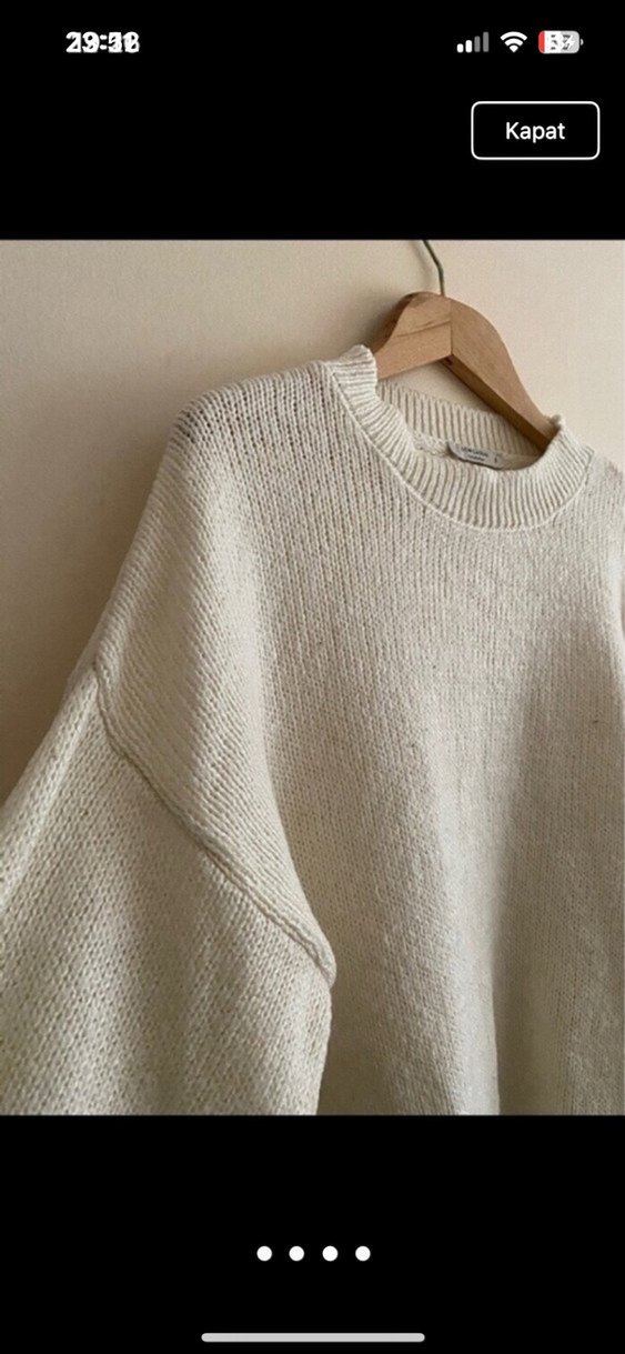 Beyaz pastel renkte, yumuşak örgü kumaştan yapılmış, yuvarlak yaka ve uzun kollu, bol kesim kadın kazak. Günlük kullanıma uygun sade ve rahat tarzda.