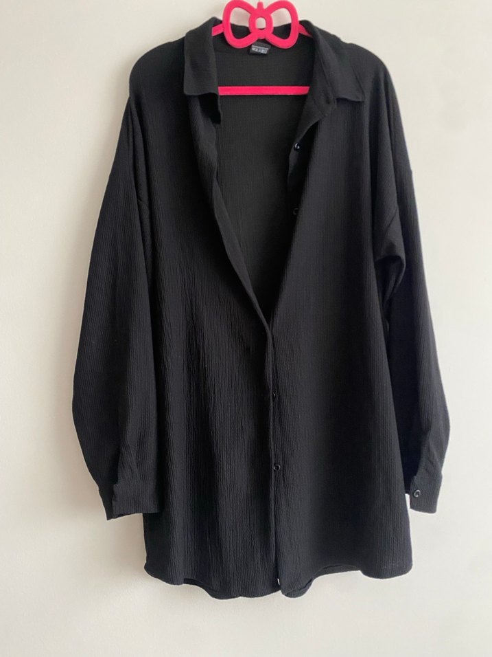 Düğmeli, uzun kollu, siyah kırışmayan kumaş gömlek. Notlu yaka ve midi uzunluk ile günlük kullanıma uygun rahat kesim. oversize dır hiç giyilmedi dolabımda durdugu için satmak istiyorum