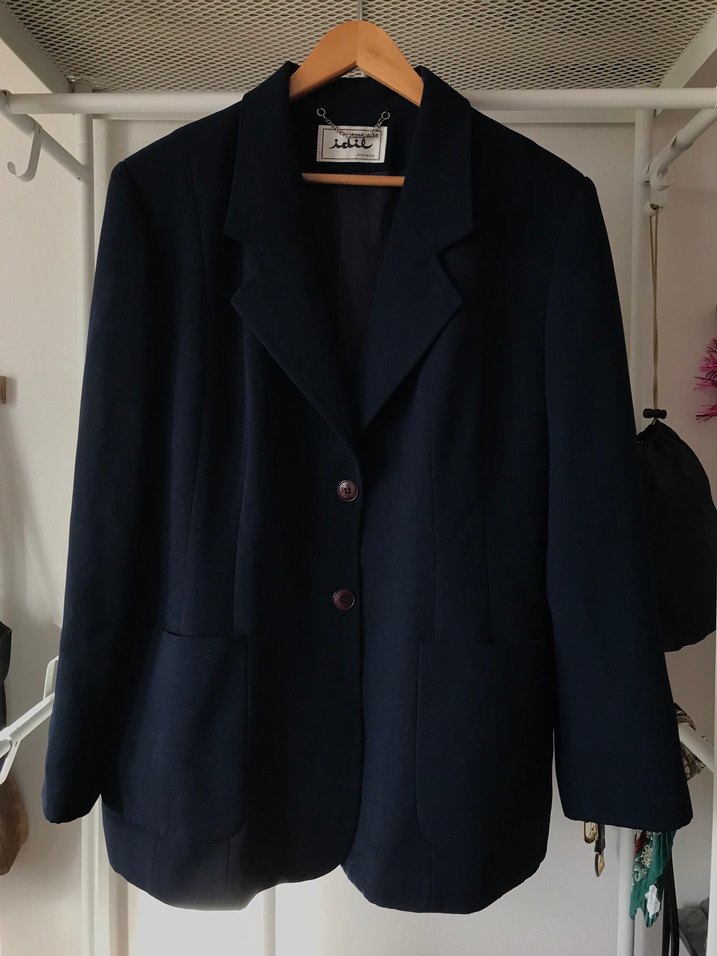 Hiçbir kusuru yok, sayılı kullanıldı. Yeni gibi tertemiz. Ankara’nın eski kaliteli giysi markalarından. Vatkalı, çok şık bir parça. Etiketi kesik ama yün karışımlı olduğunu düşünüyorum. Göğsü dıştan 56 cm, boyu 77 cm, kolu 61 cm.