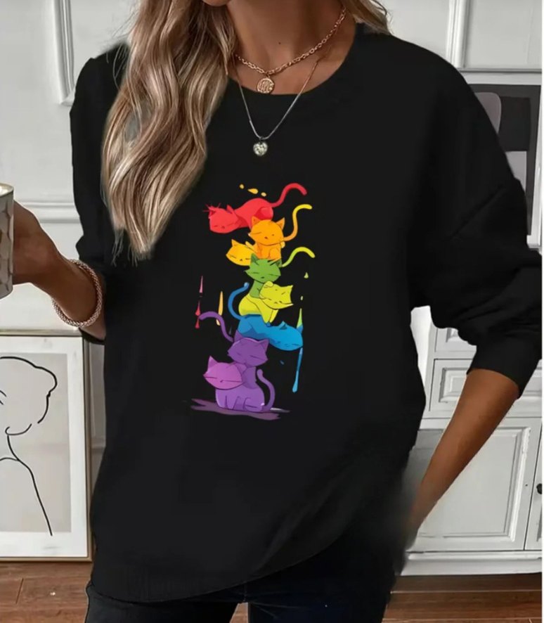 Kadın sweatshirt, yuvarlak yaka ve uzun kolludur. Çok renkli, üst üste dizilmiş kedi baskısı bulunur.Günlük rahat giyim için uygundur. S - M - L - XL - 2XL