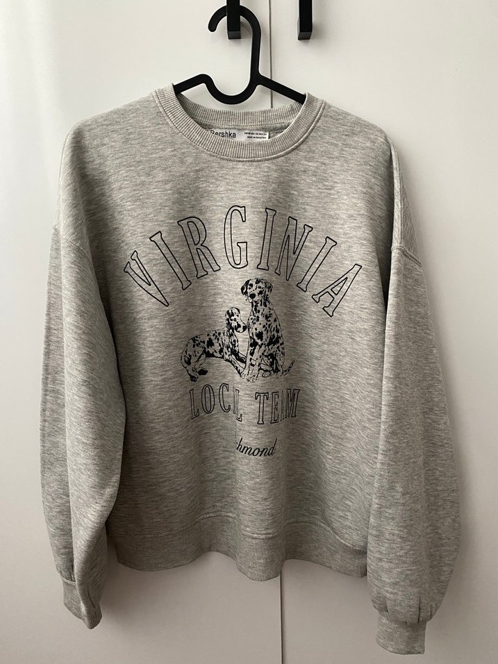 Gri renkte, uzun kollu, bisiklet yaka ve bol kesimli kadın sweatshirt. Önü baskılı, yumuşak örme kumaştan, rahat sokak stili için uygundur.