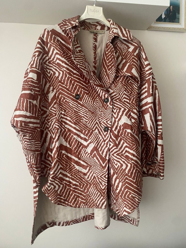 Kadınlar için bol kesim, uzun kollu, yakası kesik ve düğmeli trençkot tarzı. Koyu kahverengi batik desenli, bohem ve sokak tarzını yansıtır. Günlük kullanım için uygundur. Oversize trençkot 38-40 beden çok rahat olur. Tertemiz