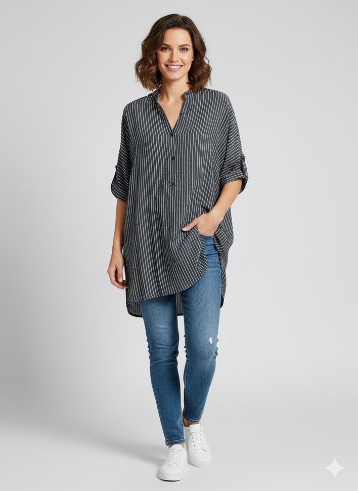 Oversize kesim olduğu için S/M/L bedenlere de rahatlıkla uyum sağlayabilir. Kumaş İçeriği: %100 Viskon (Hafif, dökümlü, nefes alan ve cilde dost bir kumaştır.) Durum: Yeni gibi/Az kullanılmış Kesim: Trend olan oversize ve salaş kesimi sayesinde rahat ve modern bir duruş sağlar. • Yaka: Klasik hakim yaka (bandana yaka) detayı. • Boy Detayı: Arka boyu 86 cm, ön boyu 80 cm'dir. Hafif asimetrik kesimi (arkası daha uzun) ile şık bir görünüm sunar. • Kumaş Kalitesi: %100 viskon içeriği sayesinde tenle teması çok rahattır, dökümlü ve zarif durur. Yaz ve bahar ayları için idealdir. • Kullanım: Gömlek veya tunik olarak kullanılabilir. Jean, tayt veya kumaş pantolonlarla kolayca kombinlenebilir. Detaylı Ölçüler • Gömlek Boyu (Arka Kısım): 86 cm • Gömlek Boyu (Ön Kısım): 80 cm