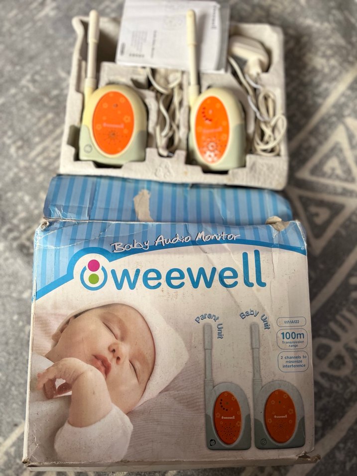 Oweewell bebek ses monitörü, pastel beyaz renkte, iki birim ve 100m menzil ile bebeğinizi net şekilde izlemenizi sağlar.