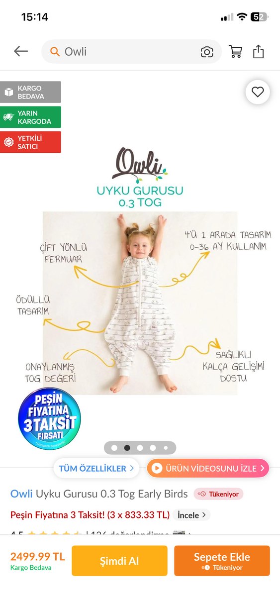 1 kez yıkandı 2 tane olduğu için bunu hiç kullanmadık Owli bebek uyku tulumu pamuk kumaştan, baskılı desene sahiptir. Çift yönlü fermuarı ve sağlıklı kalça gelişimini destekler. 0-36 ay için 0.3 tog değerindedir.