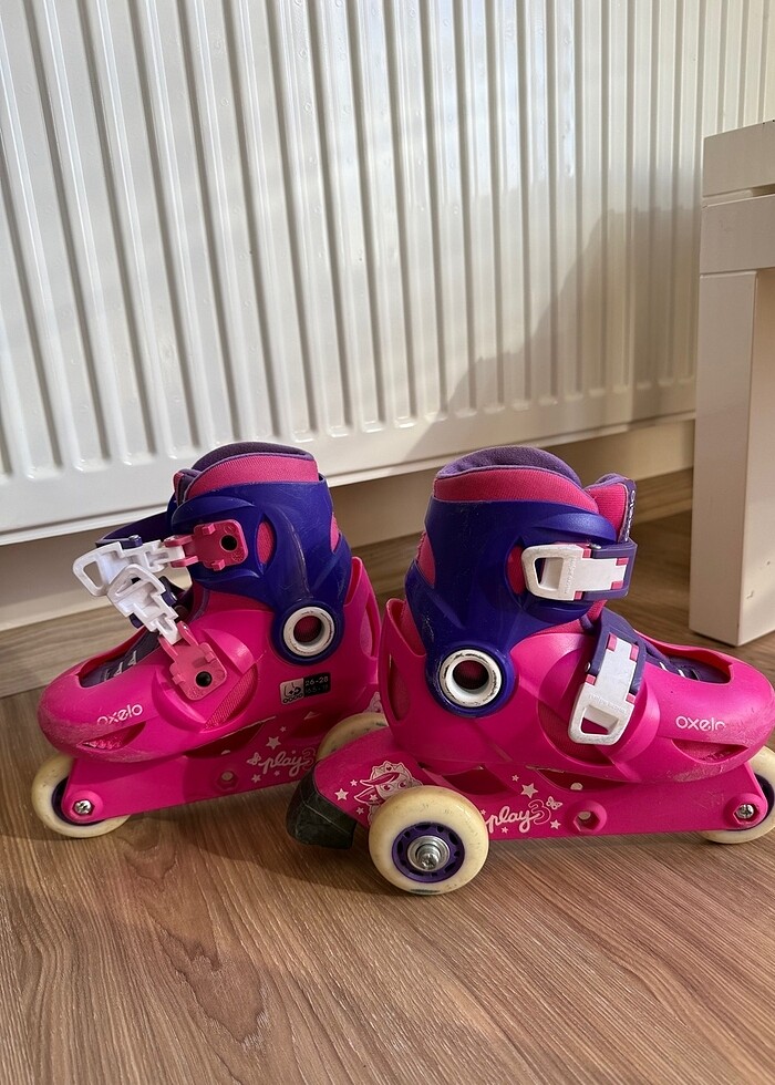 Decathlondan alınmış Oxelo marka çocuk pateni. 26-28 arası numaralara ayarlanabiliyor. İsterseniz üç teker arka arkaya sıralı olarak ya da 2 arka+1 ön şeklinde ayarlayarak kullanabilirsiniz. Ürün temizdir. Fotoğraflardan görüleceği üzere ön tarafta kullanıma bağlı hafif çizikler vardır. Topuk freni bile sağlam durmaktadır.