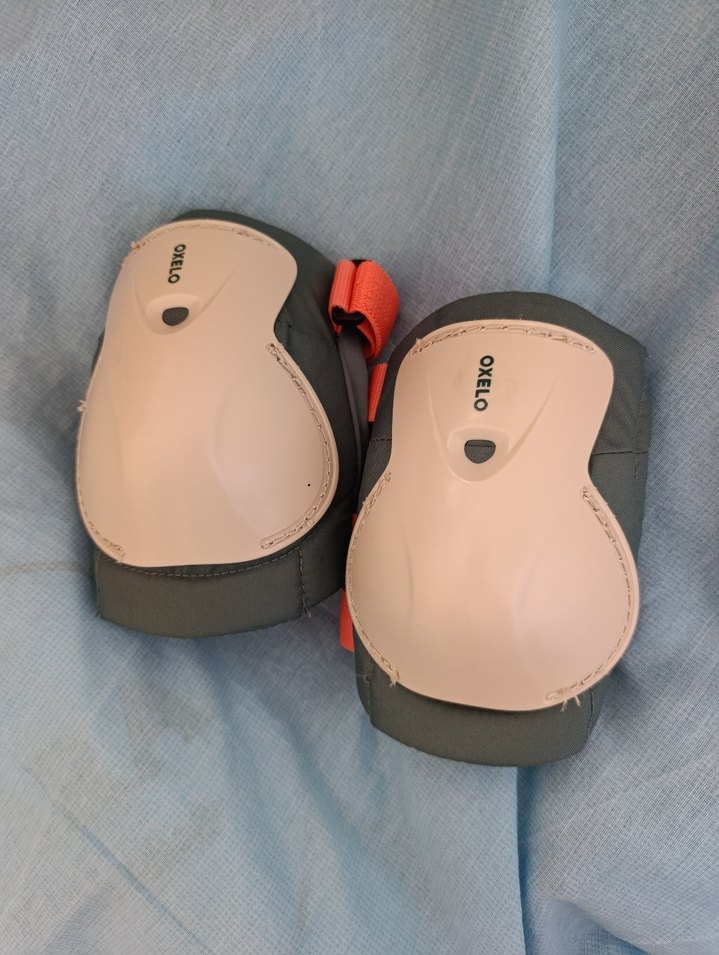 OXELO marka gri diz koruyucuları, yumuşak fleece astar ve cırt cırtlı bantlarla güvenli tutuş sağlar. 3.5 yaşındaki oğluna büyük geldi