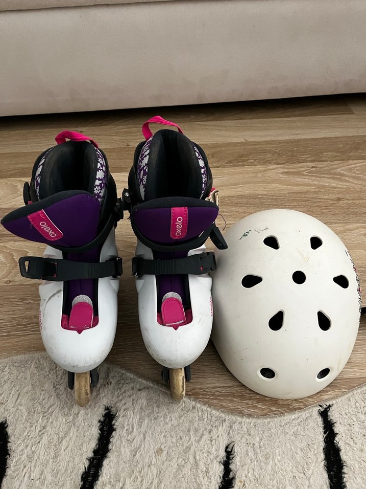 Beyaz kaykay patenleri, cırt cırtlı bantlara ve kauçuk malzemeye sahiptir, beyaz koruyucu kask ile birlikte gelir. 34-36 numara arası