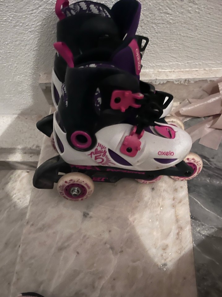 Oxelo marka, koyu pembe-beyaz renkli çocuk patenleri, ayarlanabilir kayışlar ve dört tekerlek ile rahat sürüş sağlar.