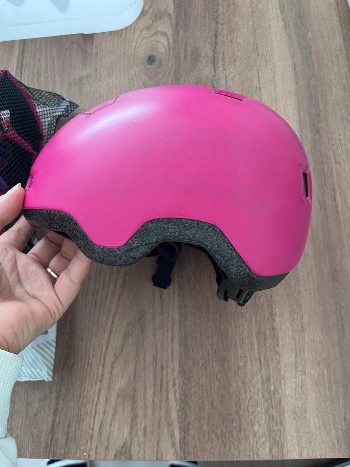Düz pembe mat renkte, plastik malzemeden yapılmış biker tarzı kask, Velcro kapamalı güvenli tasarım ♀️paten kaskı hiç kullanılmadı