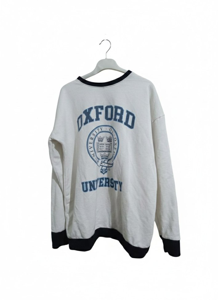 Pamuklu beyaz sweatshirt, yuvarlak yakalı ve uzun kolludur. Oxford Üniversitesi baskısı ve siyah yakalık, manşet ile etek ucu detayları vardır. Rahat kesimdir.