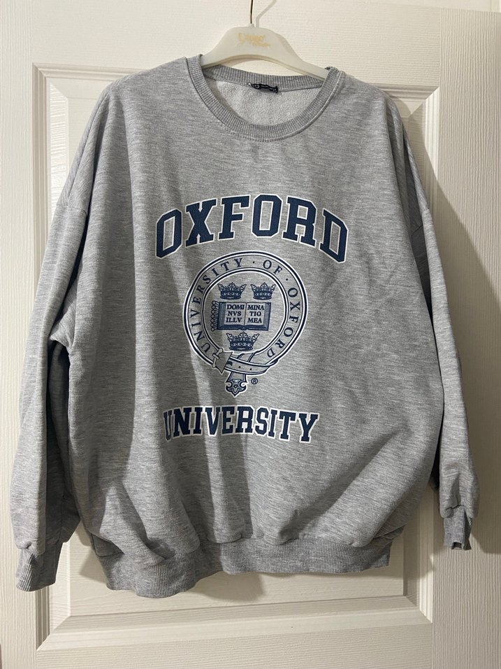 Oxford baskılı gri kadın sweatshirt, yuvarlak yaka ve uzun kollu. Rahat kesimi ve yumuşak, sıcak kumaşıyla günlük kullanıma uygun.