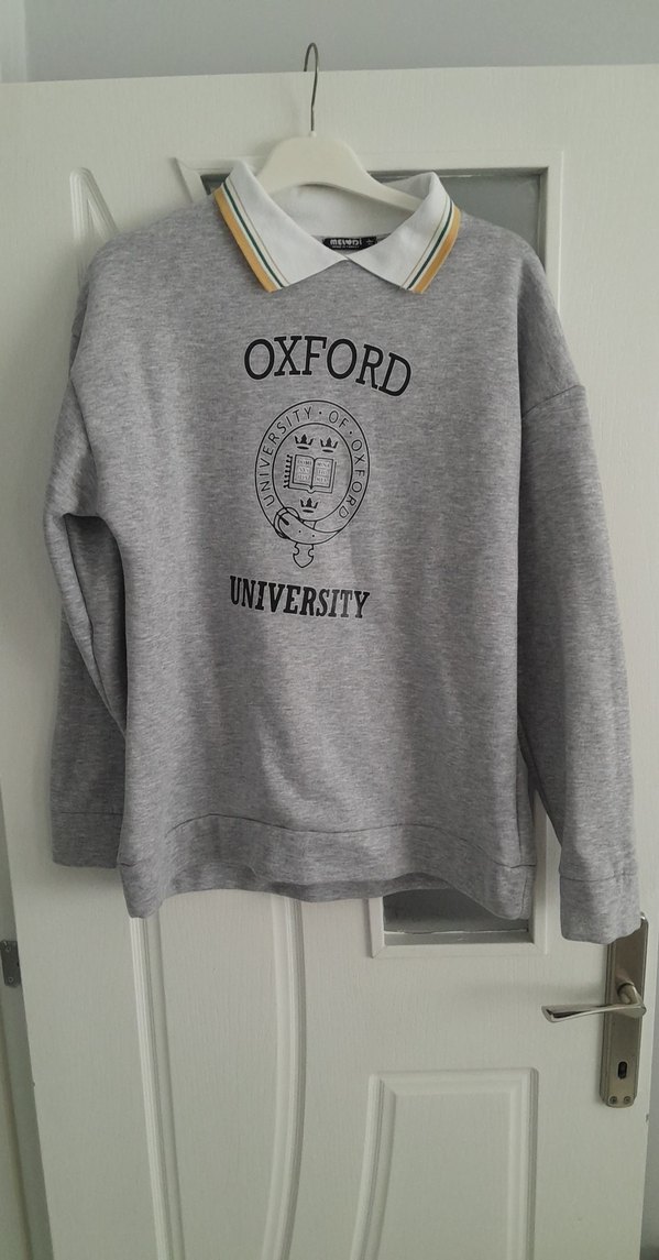 Oxford Üniversitesi baskılı, uzun kollu, bisiklet yaka, gri renk, bol kesim sweatshirt. Yumuşak ve sıcak kumaştan, günlük sokak stili için uygun.