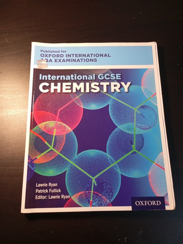 Oxford tarafından AQA sınavları için yayımlanan Uluslararası GCSE Kimya kitabı, birkac kez kullanıldı, icinde kursun kalem ile yazılı bölümler var.