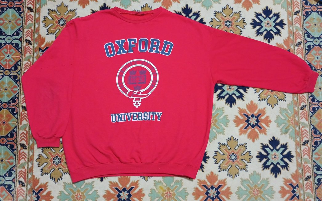 Kırmızı, yuvarlak yakalı ve uzun kollu sweatshirt. Önünde renkli Oxford Üniversitesi baskısı bulunur. Yumuşak ve sıcak kumaştan üretilmiştir. Ufacık leke ve kolunda ufacık delik var. Kullanıma engel değil. Gönül rahatlığıyla kullanabilirsiniz.