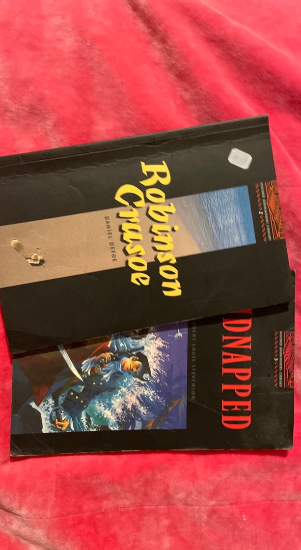 Macera temalı lise kitapları kidnapped ve Robinson Crusoe, resimli kapaklara sahip. İngilizce reading geliştirmek için ideal. Arkasında okuduğunu anlama sorulari var öğrenciler için uygundur