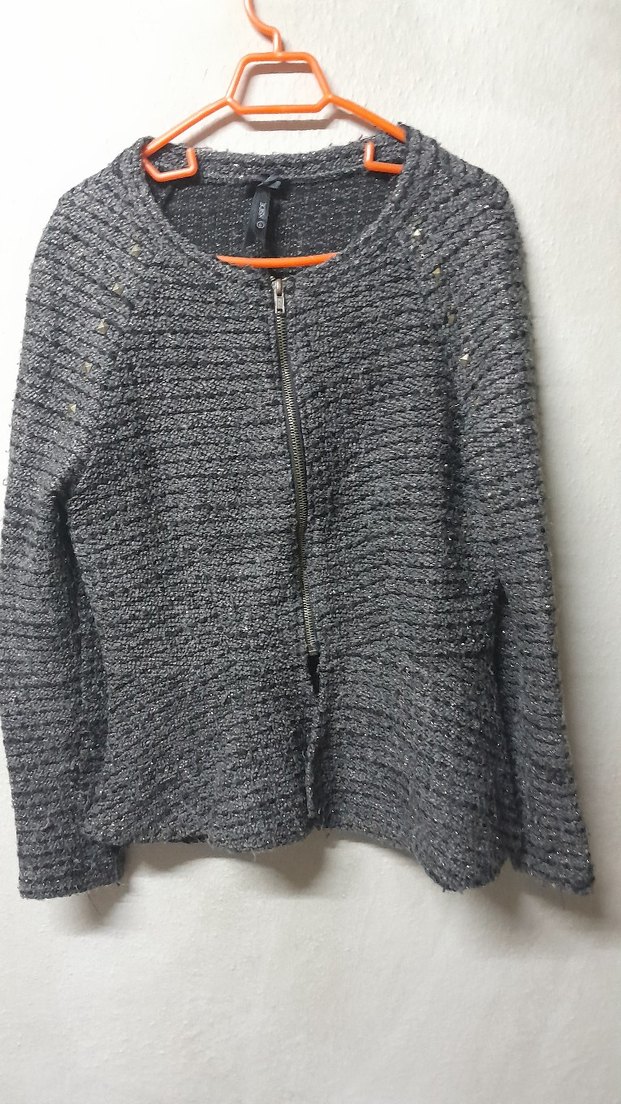 Rengi füme/gri, önden fermuarlı. Herhangi bir leke, yırtık ya da deformasyon yok. Sadece birkaç kez giyildi, tertemiz.