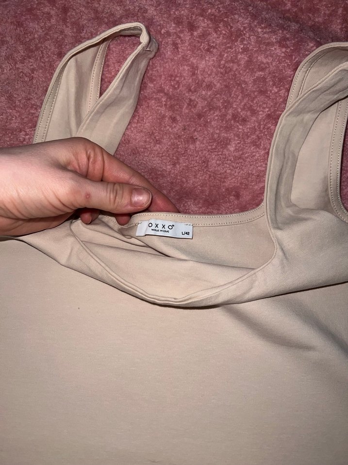 Oxxo L Bej renkte, normal midi boyda ve vücuda oturan askılı bluz.