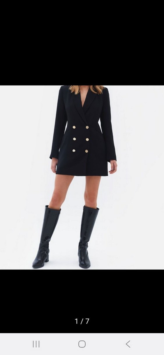 Görseldeki ceket elbisenin aynısı sadece ben düğmelerini değiştirdim. Aldığımda da sarı düğmelerde kararmalar vardı ve kalın kaba duruşu vardı daha ince kibar düğmlelerle değiştirdim. isterseniz orjinal düğmelerini de gönderebilirim. sadece 1 kere eğlencede giydim hiçbir kusuru yok temizdir. Kumaşı tok ve kaliteli üzerinizde cılız bir duruşu yok çok güzel duruyor. 36 bedene uygundur.