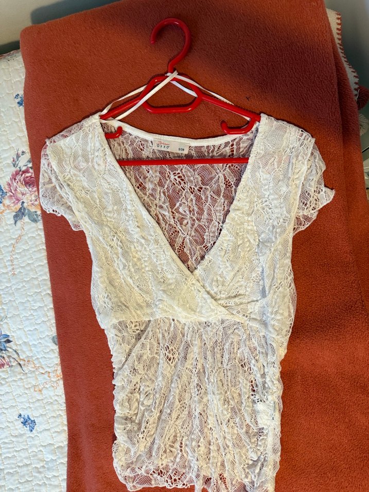 Dantelli, beyaz, V yakalı ve kısa kollu, bohem tarzda, vintage-uyumlu dar kesim bluz. Hiç giymedim bedeni büyük geldiğinden satıyorum.