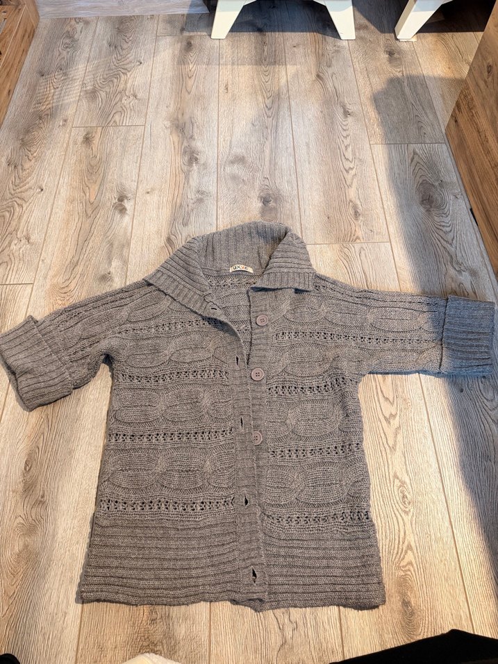 Oxxo marka, 3/4 kollu, Triko dokulu, bohem stil gri kadın hırkası, uzun kollu ve boğazlı yaka ile midi boyda, rahat ve gündelik kullanıma uygun.